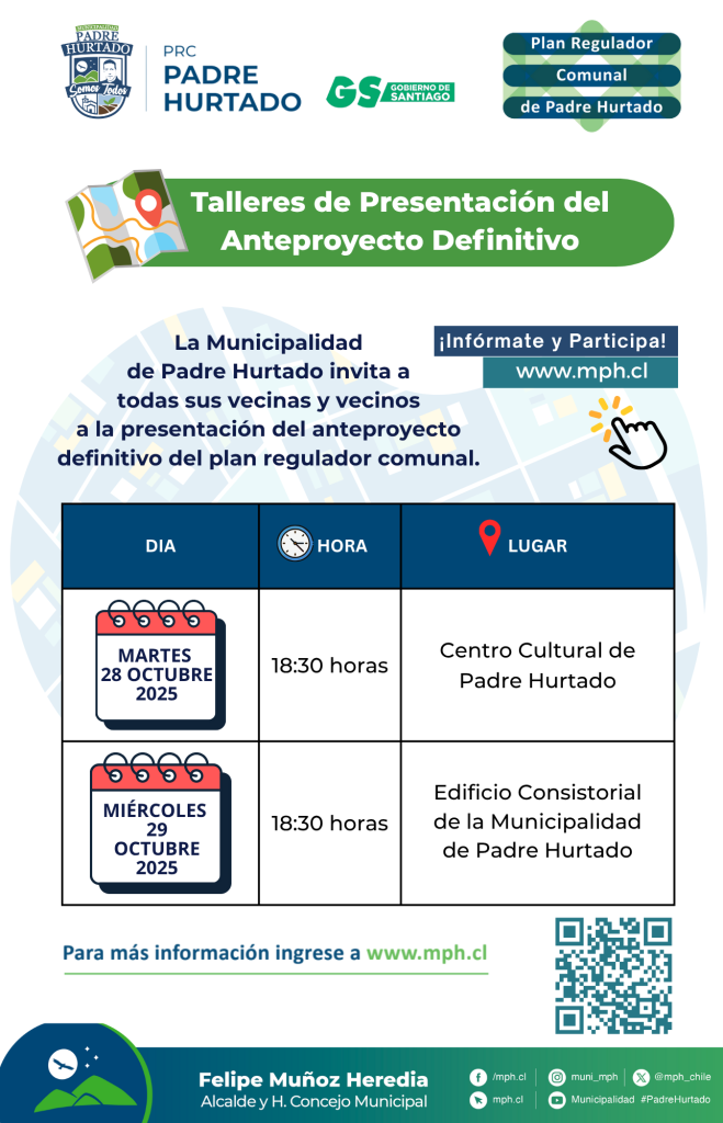 La comuna de Padre Hurtado cuenta desde el año 2004 con un Plan Regulador Comunal (PRC), que establece las normas sobre el desarrollo del área urbana, referidas a cómo se construye, usa y organiza el territorio.